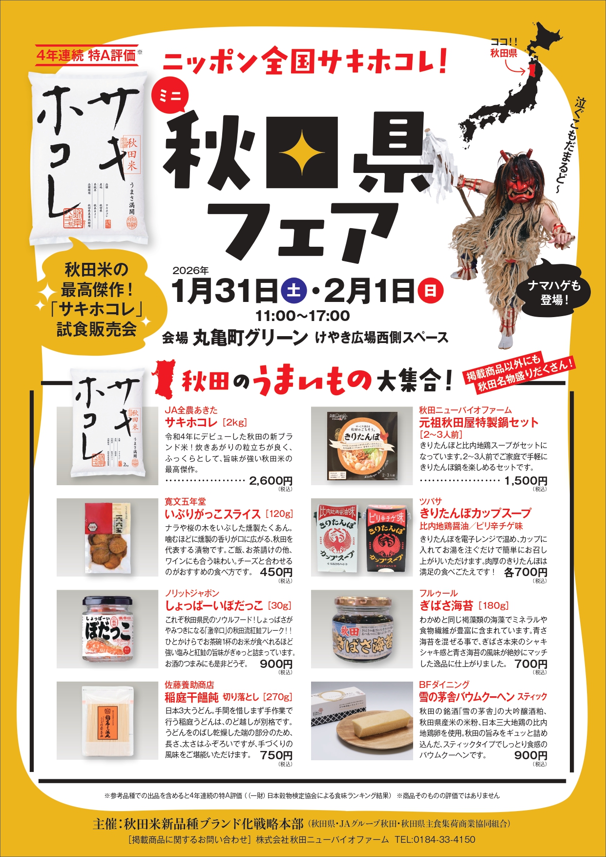 Share ニッポン全国サキホコレ!ミニ秋田フェア 期間|01.31(土)〜02.01(日)11:00-17:00 秋田県が主催する秋田フェア。秋田が誇る秋田米の最上位品種「サキホコレ」の試食販売や、いぶりがっこやきりたんぽなどの特産品を販売。ナマハゲも応援に来るよ!
